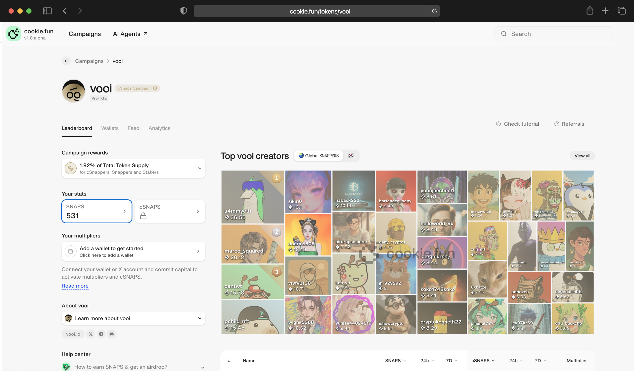 Despite its tech edge, VOOI wasn’t commanding attention on crypto Twitter (CT). To close that gap, the team launched a 4-month Cookie SNAPS campaign, committing 1.25% of total token supply to reward creators and expand global reach.
